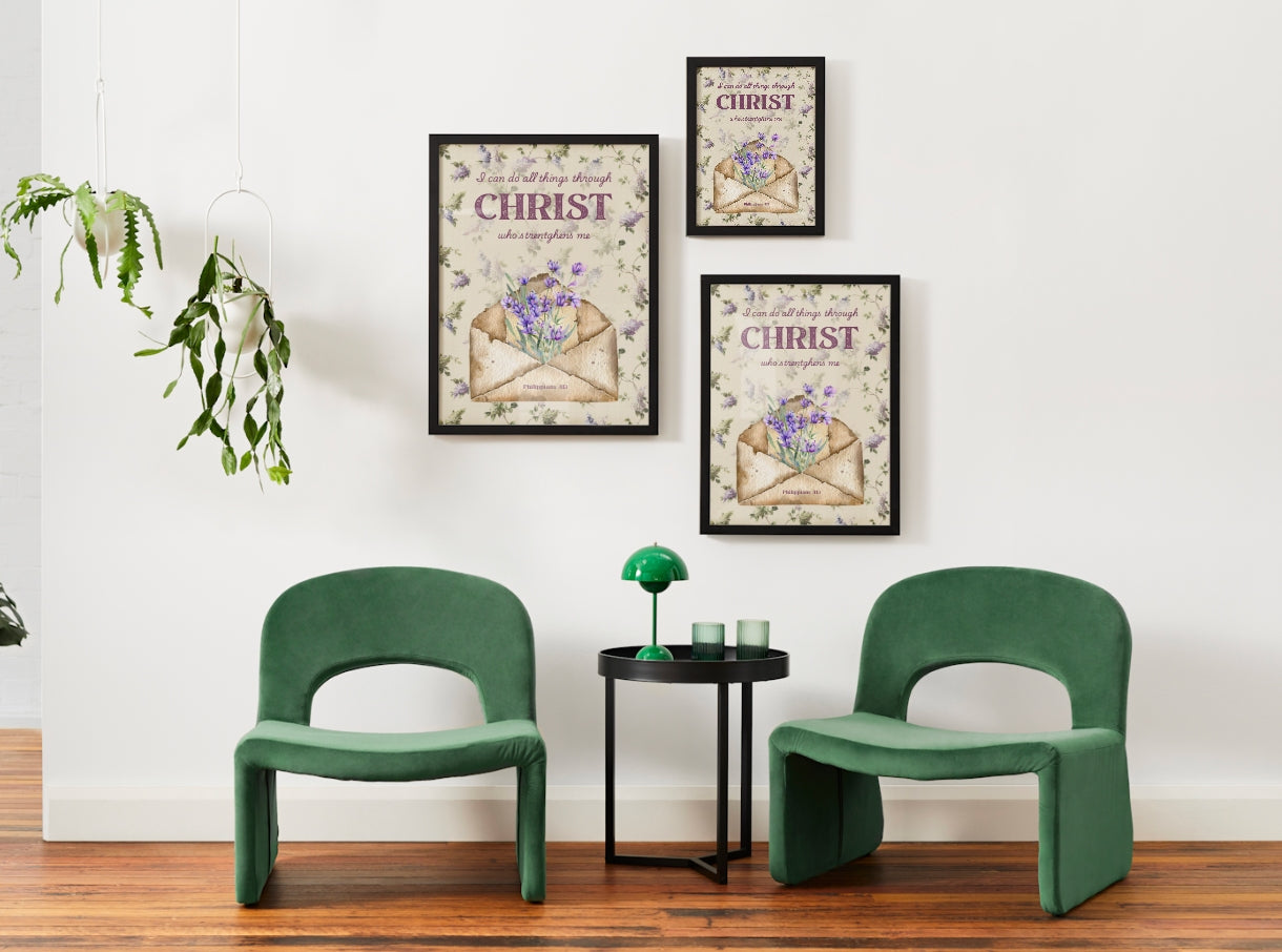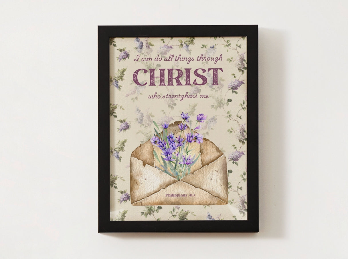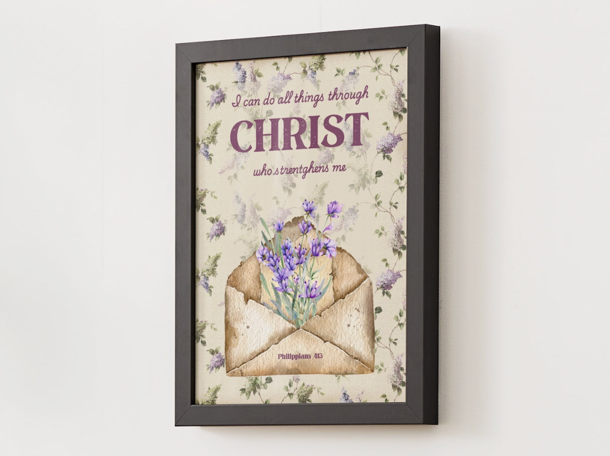 A beautiful scripture print inspired by Philippians 4:13, “I can do all things through Christ who strengthens me.” This artwork reminds you daily that your strength comes from Him. Soft lilac flowers and vintage tones create a calming, faith-filled atmosphere for your home, office, or prayer space.